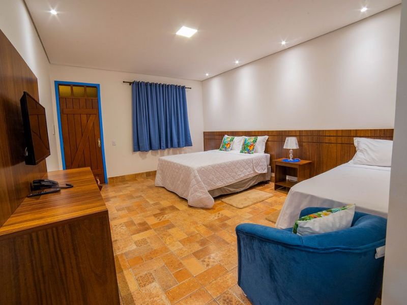 - Suíte Triplo/Quadrúplo: apartamento com Ar Condicionado Split Quente e Frio, Cama Box, Tv “40”, Tv a Cabo, Internet Wi-fi, Frigobar, Telefone, Ducha Elétrica Duo Shower, Secador de Cabelo, Amenities, Cama Box Solteiro com Auxiliar em Baixo.