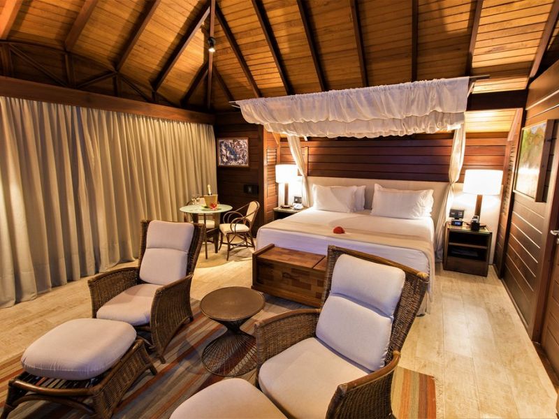Bangalô Vista Mar: Possuem uma area de 64m2, com ampla varanda, piscina privativa de profundidade variada e gazebo. Um ambiente aconchegante composto por conjunto de mesa para refeição, poltronas de leitura mesclam-se com o quarto do casal. Equipado com telefone, TV LED, canais por assinatura, DVD, ar-condicionado, frigobar, máquina de espresso, radio-relogio com bluetooth, banheira, ducha independente e secador de cabelo.