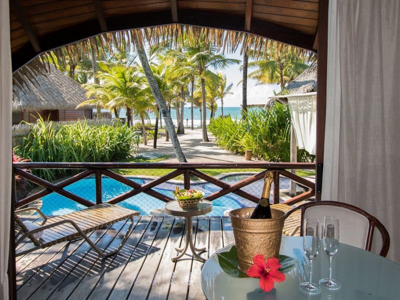 Bangalô Beira Mar: Possuem uma área de 64m2, com ampla varanda de vista privilegiada, piscina privativa de profundidade variada e gazebo particular. Um ambiente de estar acolhedor composto de conjunto de mesa e cadeiras mescla-se com o quarto do casal, equipado com TV por assinatura, DVD, ar condicionado e ventilador de teto, sofá-cama, rádio-relógio, banheira e ducha (independente), secador de cabelo, telefone, frigobar, máquina de café expresso e cofre eletrônico.