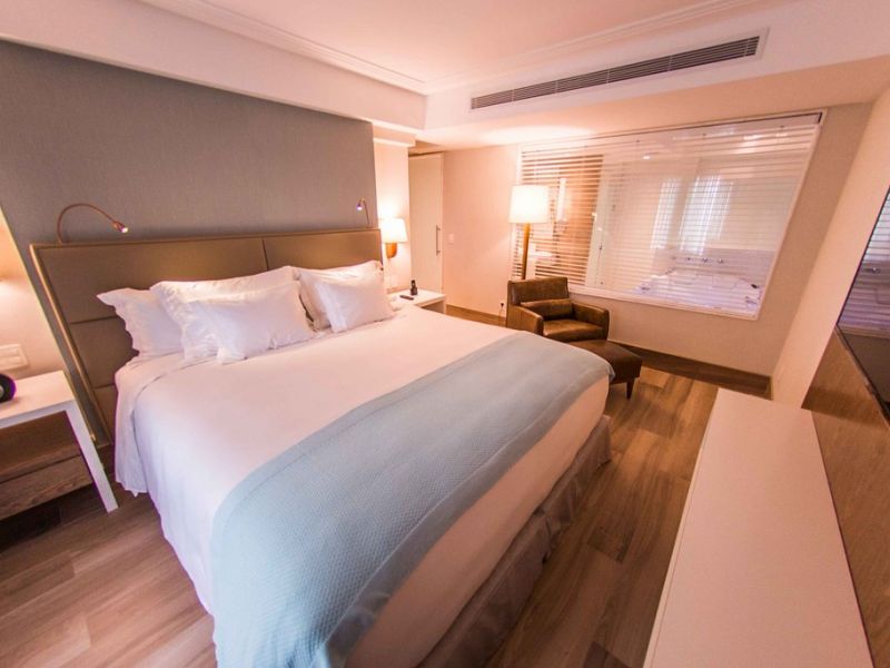 Suíte Premium: Charme e bom gosto se unem nas suítes Premium, com vista para o mar, mobiliário elegante e todo o cuidado para proporcionar uma estadia inesquecível.