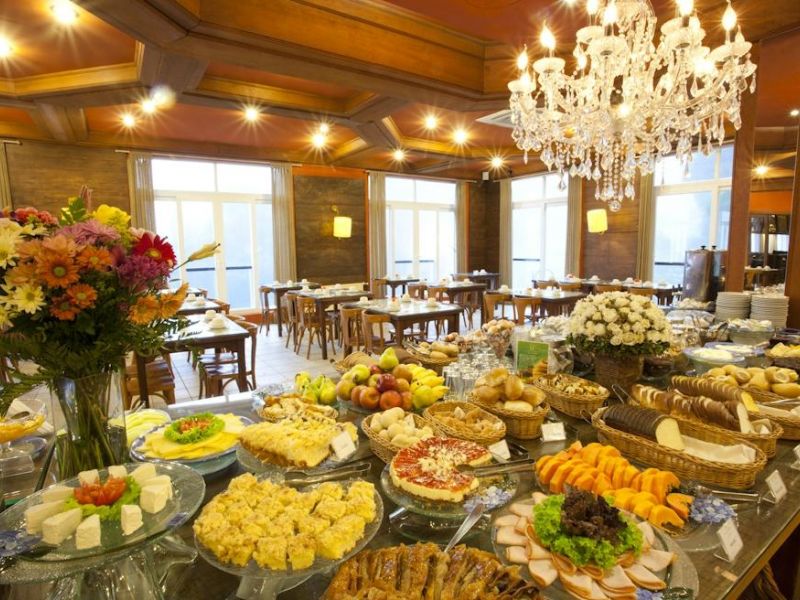 O espaço do café da manhã do hotel é um rico buffet de frutas, sucos, pães artesanais, cucas, frios, pratos quentes e confeitarias inesquecíveis. Tudo isto finalizado com uma taça de espumante e música de piano ao vivo.